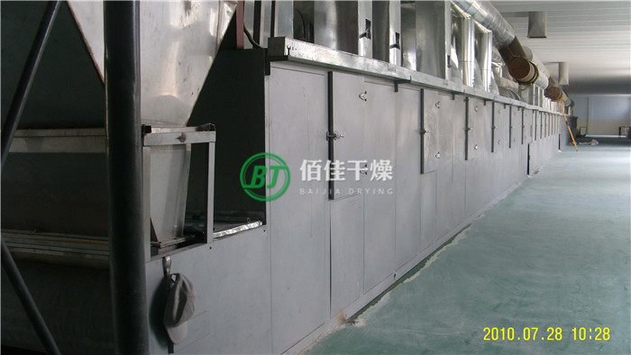 由三台网带式干燥机串联,形成了预热段,水份蒸发段及物料升温段。由于硅胶干燥机的特殊性,第一台干燥机的温度不宜太高,控制温度在80-100℃之间,网带速度可以稍快一点,第二台干燥机温度可以适当提高,控制温度在 100~120℃之间,网带的运行速度则适当降低,第三台干燥机温度可以逐步升高,控制温度在 120~140℃,网带的运行速度则更低。
