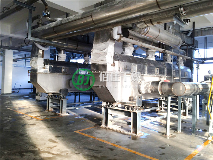 物料自进料口进入机内,在激振力作用下,物料沿水平方向连续运动、热风穿过流化床向上同物料换热后,由排风口排出,干燥物料由排料口排出。